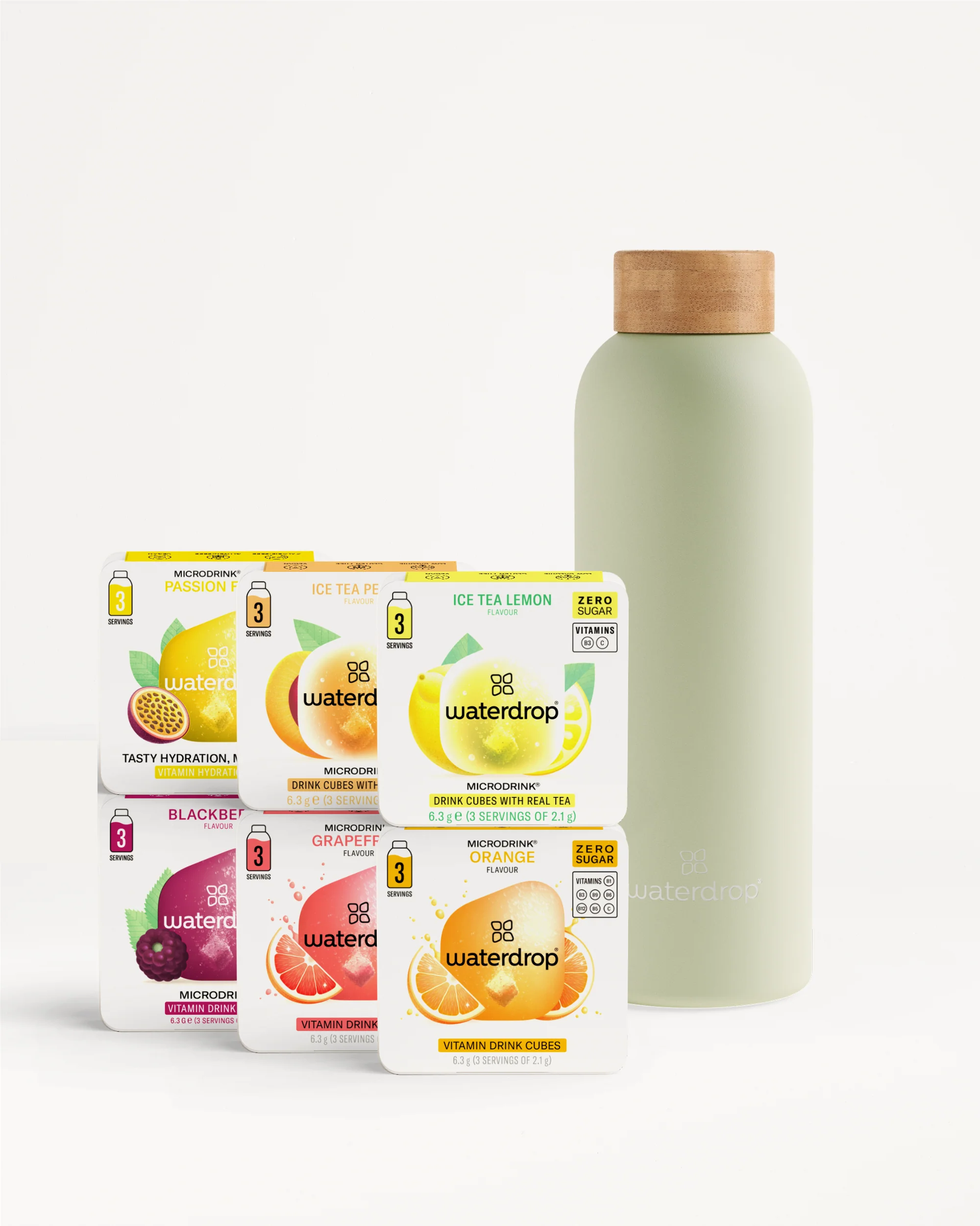 Find your favourite with our set of 6 Microdrink flavours in convenient 3-Packs, including one of our high-quality Stainless Steel Thermo Bottles (600ml) in a colour of your choice!